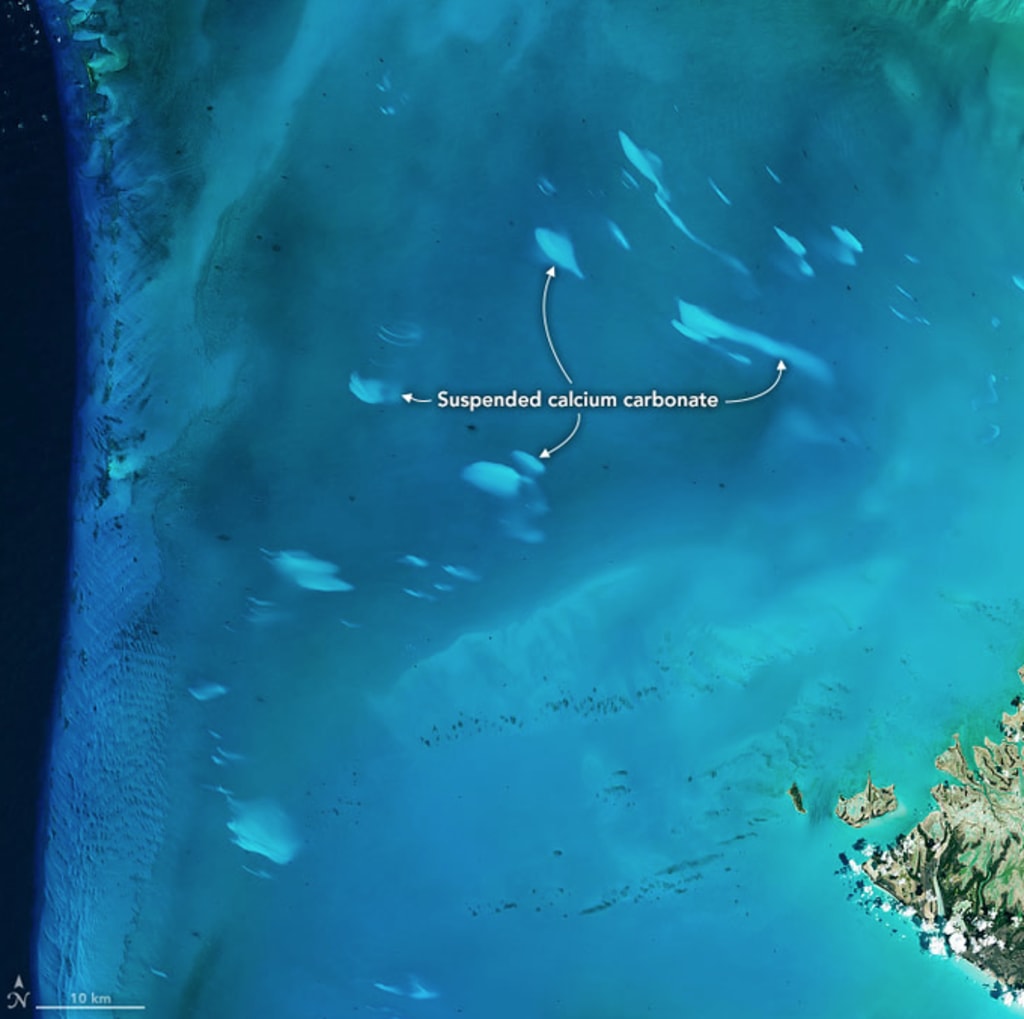 From the information they have so far scientists believe that the white patches may contain particles that are rich in carbon the Bahamas Islands do sit on a big platform of carbon that stays hidden under the water, another suggested theory for these unusual clouds is that maybe they're caused by blooms of tiny plants in the water.
