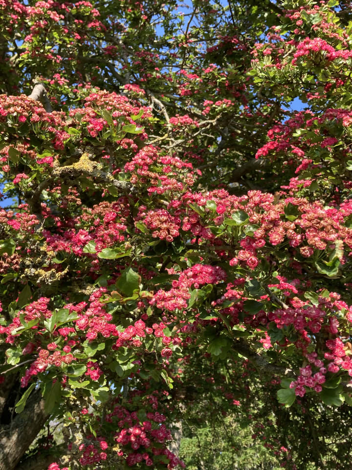 As an ode to my childhood years we went for a walk along the canal stopping to look at the beautiful green canopy above us. A stunning dark pink Hawthorn was still in gorgeous bloom and we watched people rowing boats up and down.