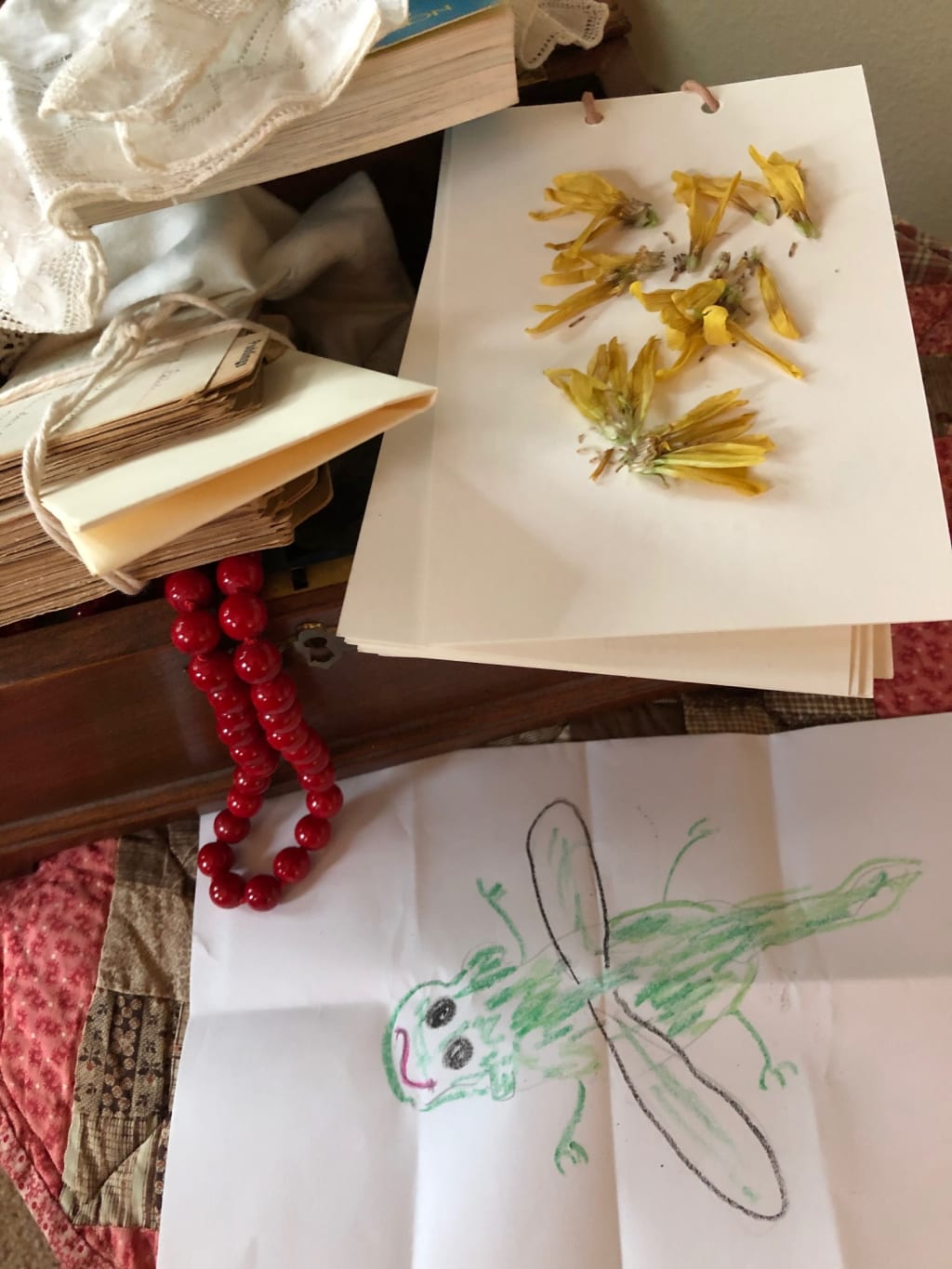 Oma had left me the keepsakes box. I had a feeling there might be a clue inside to the memory that was lingering below the surface of my mind. The box is about a foot square and filled with trinkets and tokens of the days we spent together. I hadn’t looked in it since just after she passed away. But I had kept it safe. As I opened the lid of the wooden box I could smell the scent of her lily of the valley perfume. I began pulling out the precious contents. Not that they were really valuable, They were priceless to me. On top was one of her linen handkerchiefs the source of the scent. I pulled out two pairs of earrings in a small velvet box. I’d wear them someday. They were too fancy for high school not to mention farm fields. Oma’s favorite bright red bead necklace might come in handy though. I leafed through her Field Guide to American Birds. Its dog-eared pages softened by countless days in the fields. There were rocks we’d picked up by the stream and a notebook of pressed field flowers.