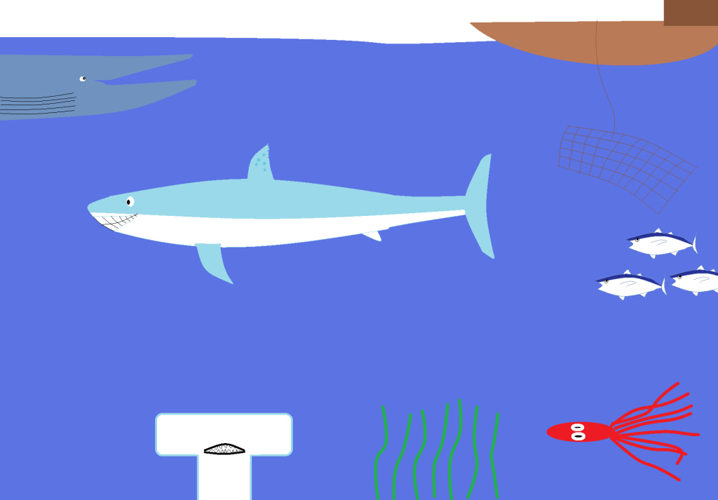 Several days later, Shawn saw something that looked a bit odd. There was a school of tuna jumbled together. Shawn swam closer to investigate. The first tuna to notice Shawn freaked out but couldn’t swim away.