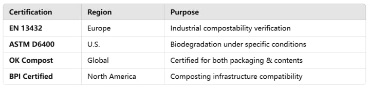 Look for EN 13432, ASTM D6400, BPI, or OK Compost certification. These guarantee full compostability in industrial or home composting environments.