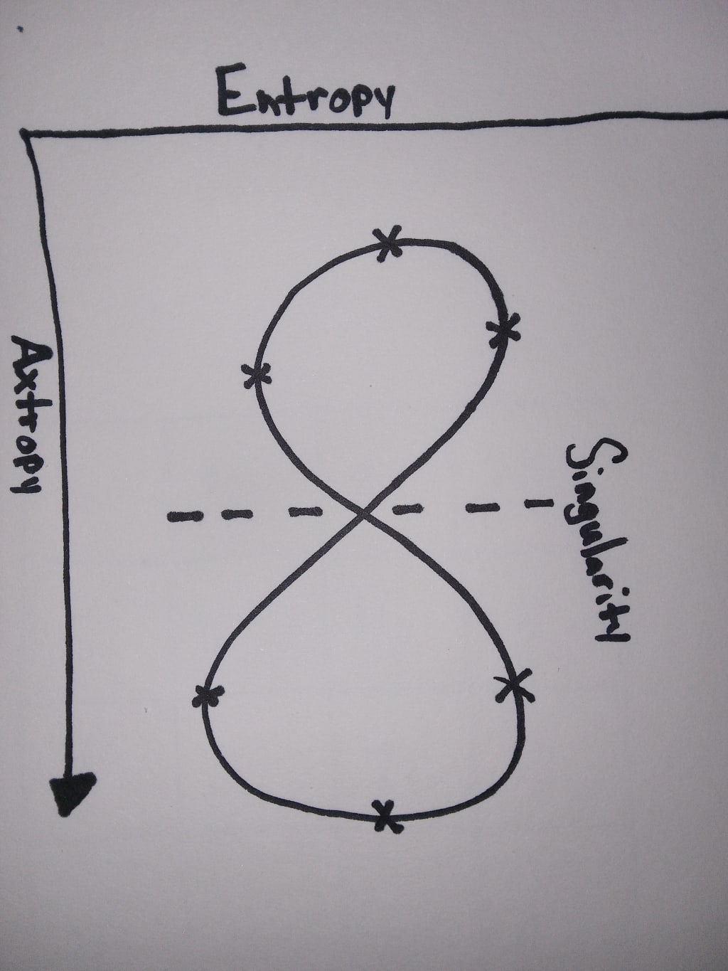 Let’s focus first on the right loop. Beginning at the singularity, we ascend the top wave—net entropy starts at zero and rises. At the first of three equilibria, entropy briefly stabilizes. This plateau is axtropy—a moment within the feedback loop where order asserts itself. Then entropy climbs again toward the second equilibrium. After crossing this threshold, a third plateau emerges—entropy once more peaking, before returning to the singularity and flowing into the left half.