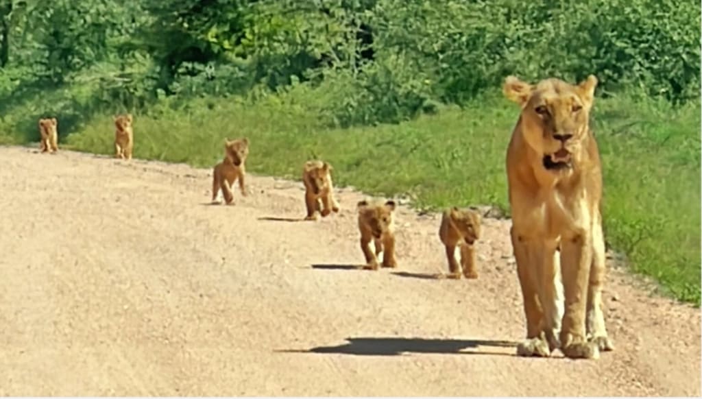 Adorable young lions learning the ropes of life while their mother leads the way