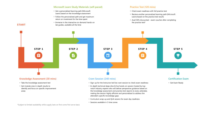 The 4 Step Program is purposely driven to deliver exam readiness with a perspective and personalized learning journey, curated to meet every learner’s need. Registered attendees will receive recommendations on specific modules to study, elevate their understanding with practice tests and comprehensive MS Learn study materials, and can access on-demand hands-on labs and interactive guides to elevate their practical insights. Moreover, registrants can join multiple instructor-led cram sessions hosted by world-class industry experts who will guide them to be ready for the next Azure certification exam. Prepare at your own pace and crack your Azure Certification Exam efficiently.