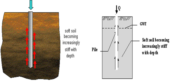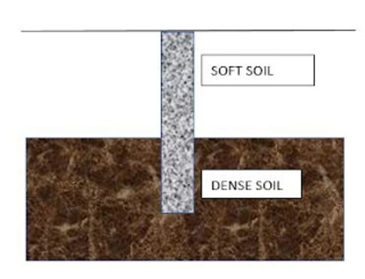End-bearing piles carry the weight from the superstructure to the hard strata through soft, compressible soil strata. As a result, end-bearing piles behave similarly to columns.