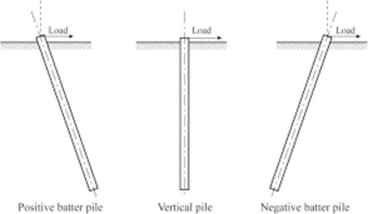 8. Batter piles: Batter piles are piles driven into the soil at an angle to the vertical to increase the foundation's load-carrying capacity. It is normally installed at a 14 to 20-degree angle to the vertical. Because offshore structures, towers, and bridges are exposed to overturning moments owing to wind, waves, and ship collisions, batter piles are widely utilized to support them. A combination of vertical and batter piles is employed to shift the overturning moment to compression and tension forces.