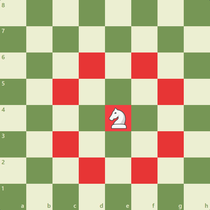 Knights (or horses) are the horse pieces next to the bishops. These are perhaps the most complex piece, moving in an L-shape forwards and backwards: