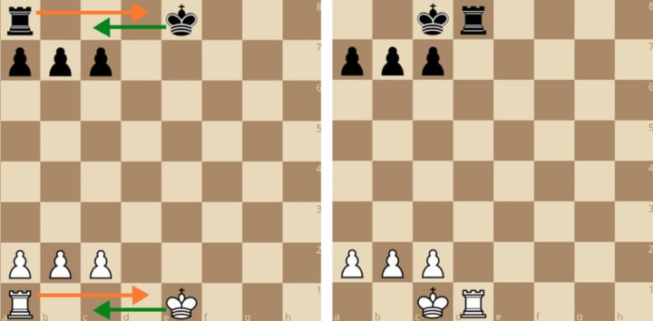 There are two special moves to keep in mind: En Passant (for pawns), and castling (for kings and rooks). After a pawn moves two squares on its first turn, an opposing pawn is allowed to capture on the square behind the pawn in a movement called En Passant:
