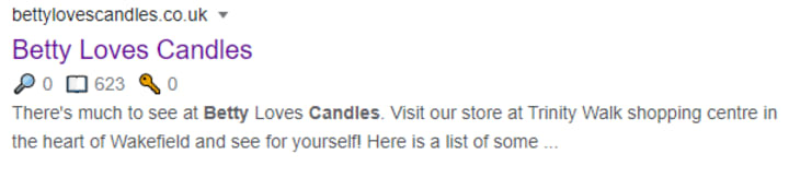 Meta description: This shows up under your title tag and is a description of what your website/business provides (Betty’s Candles is a candle shop based in London that sells candles that aid in stress relief, build confidence and help ease the mind, body and soul.)