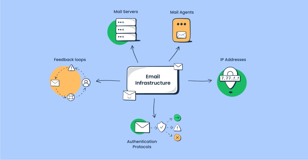 Email infrastructure consists of the following elements: mail agents, mail servers, authentication protocols, IP addresses, and feedback loops.