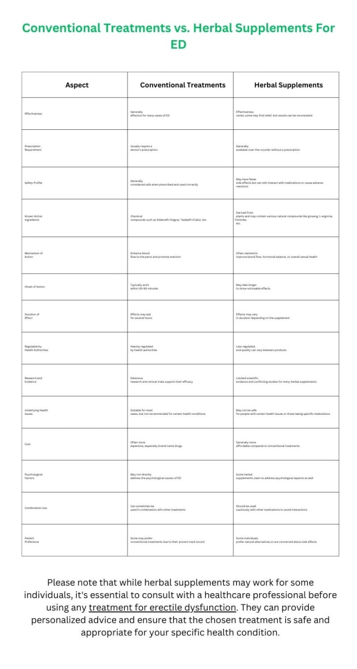 Erectile dysfunction is a common condition that can significantly impact a man's self-esteem and overall well-being. Herbal supplements and natural remedies may offer an appealing alternative to conventional treatments, but more research is needed to establish their efficacy and safety definitively.