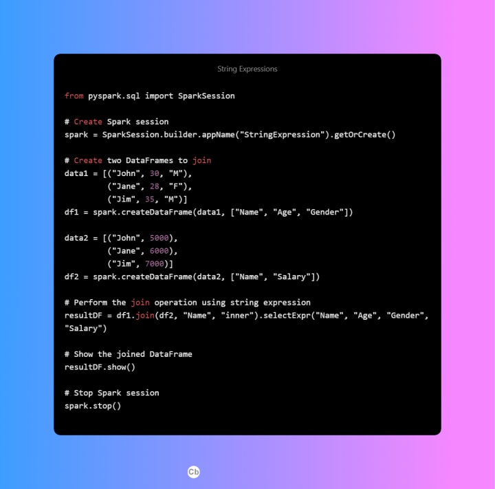 String Expression: String expressions are convenient and flexible, as they allow you to write join conditions as plain text. However, they may not be as readable as column object expressions and may require additional parsing and processing.