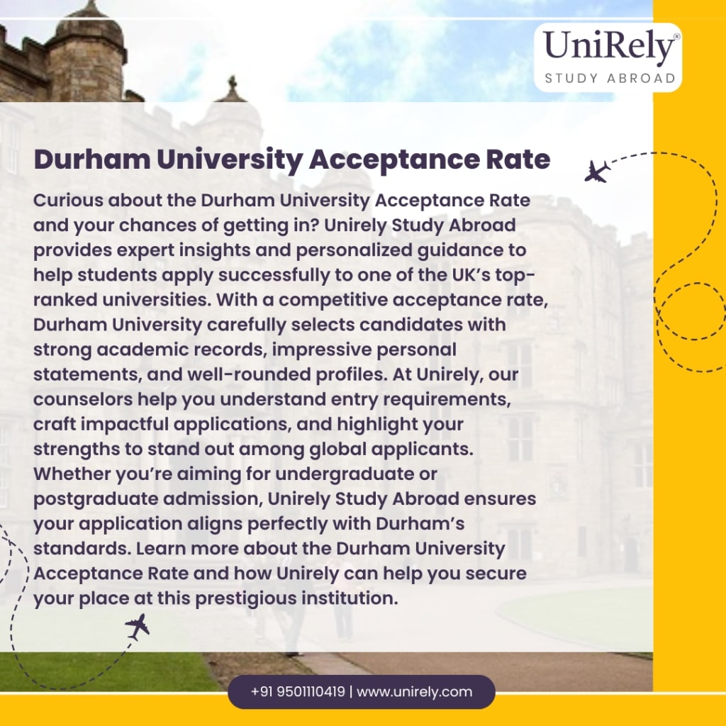 Curious about the Durham University Acceptance Rate and your chances of getting in? Unirely Study Abroad provides expert insights and personalized guidance to help students apply successfully to one of the UK’s top-ranked universities. With a competitive acceptance rate, Durham University carefully selects candidates with strong academic records, impressive personal statements, and well-rounded profiles. At Unirely, our counselors help you understand entry requirements, craft impactful applications, and highlight your strengths to stand out among global applicants. Whether you’re aiming for undergraduate or postgraduate admission, Unirely Study Abroad ensures your application aligns perfectly with Durham’s standards. Learn more about the Durham University Acceptance Rate and how Unirely can help you secure your place at this prestigious institution.