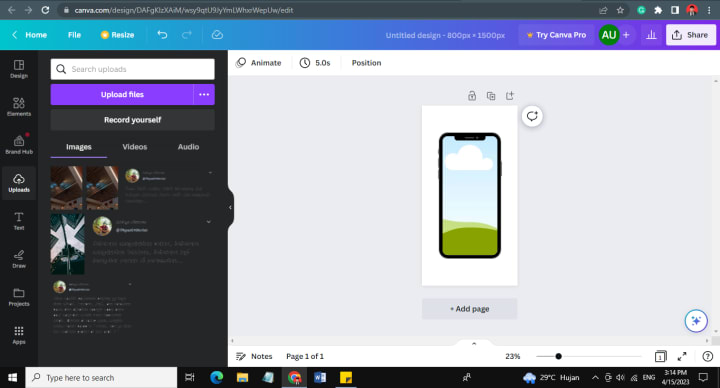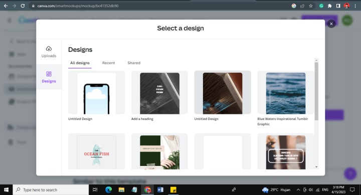 Then, you can click the Uploads button to add an image or click the Design button to add a design. It depends on your Canva mockup design preferences.