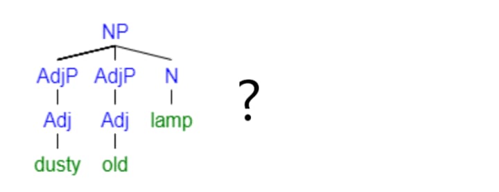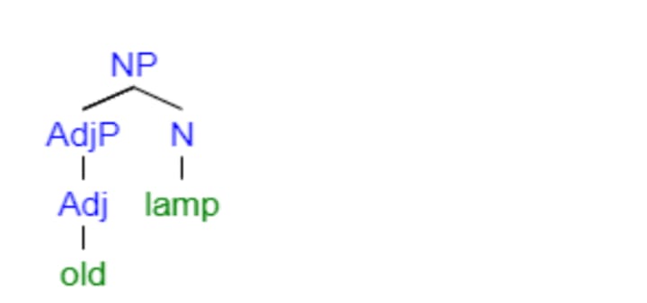 Obviously, we don't communicate in single-word phrases. Let's add a modifier to the NP, like old lamp. Very creative, I know. Now we have an adjective or, actually, a single-word adjective phrase (AdjP, so as not to confuse it with an adverb phrase, or AdvP) modifying our noun head.