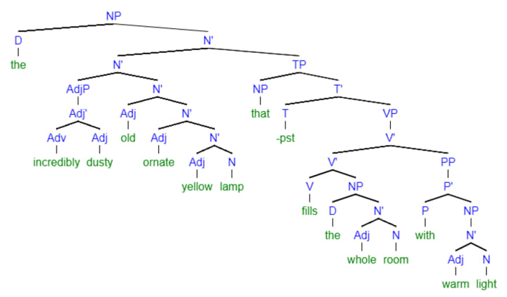 Thus, we have arrived at the complete structure of the phrase, so let me add the specifier the to incredibly dusty old ornate yellow lamp that fills the whole room with warm light: