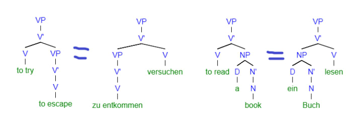 In English, VPs are head-initial, meaning, the verb comes first and then do the complements (generally). Meanwhile, German VPs are strongly head-final, so instead of saying to try to escape, they would say something like to escape try, or zu entkommen versuchen. Understanding this principle makes learning German sentence order much easier, as you realize that it's not simply that different situations trigger different word orders, it's that the verb is always in this position, except it has to move in the presence of certain parameters we'll touch on later, and the move is always the same.