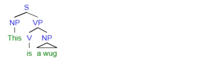 Now what about the subject? Intuitively, we feel that the he in he drove a car doesn't directly modify the verb phrase, nor does the verb modify the NP; rather any sentence consists of a NP and a VP of equal hierarchical position unless one of these is missing. That's the aspect in which the first tree in this section (This is a wug) is right.