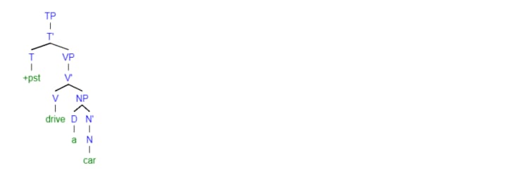 The head of a tense phrase is most often an abstract parameter such as the past (+pst) or the present (-pst, meaning, not past) but its effects are nevertheless quite tangible, resulting in a change in the verb. For example, the phrase drove a car would look like this: