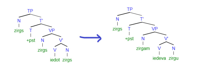In the last example, not only does the word order change but a whole new word appears when you change the word order. The grammatical relations are still the same but we can't draw a normal tree of this, or can we? What's going on here?