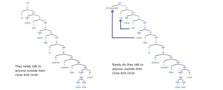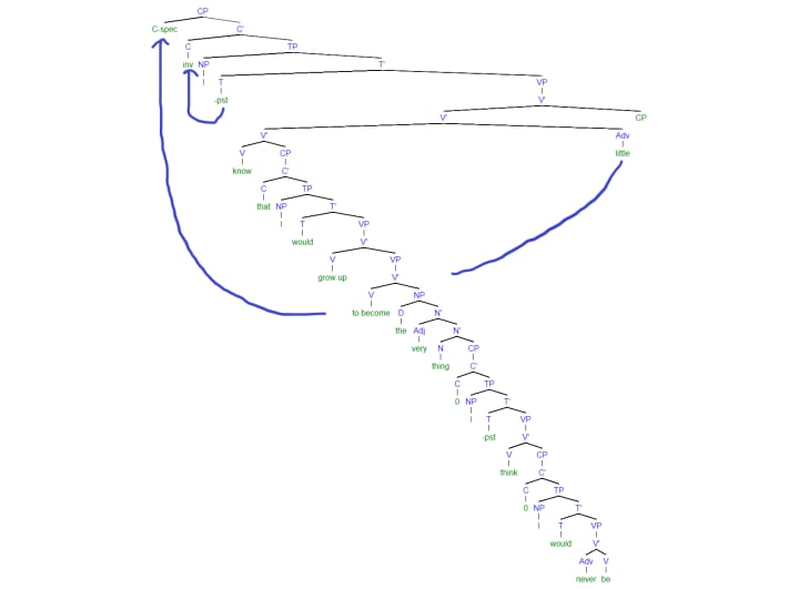- Since the main C=inv, the sentence structure is inverted, meaning, the adjunct of V, the Adv little, moves to the specifier of the CP, while T moves to C=inv, as in questions, transforming from -pst to did.