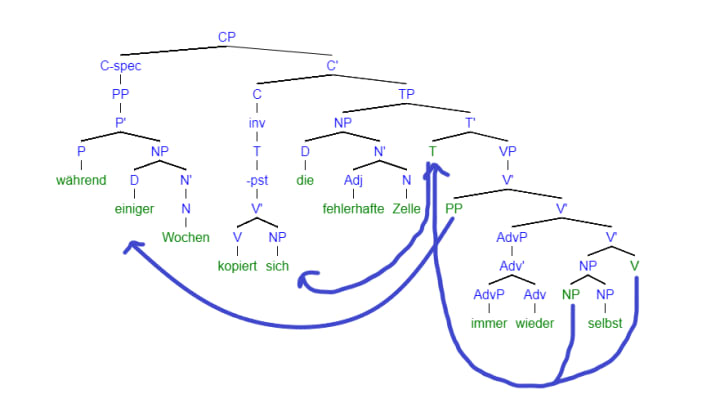 I've been learning German recently, and having learned about X-bar structures in the syntax chapter of my introductory linguistics textbook, I decided to try applying it to my target language for fun (and understanding, too, of course), so I decided to try to get the hang of the German sentence structure early as a beginner so that I would have a framework that would help me understand and form new sentences.