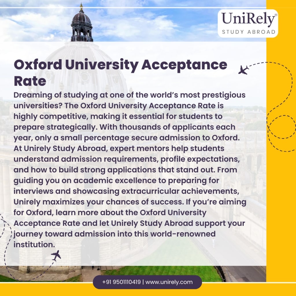 Dreaming of studying at one of the world’s most prestigious universities? The Oxford University Acceptance Rate is highly competitive, making it essential for students to prepare strategically. With thousands of applicants each year, only a small percentage secure admission to Oxford. At Unirely Study Abroad, expert mentors help students understand admission requirements, profile expectations, and how to build strong applications that stand out. From guiding you on academic excellence to preparing for interviews and showcasing extracurricular achievements, Unirely maximizes your chances of success. If you’re aiming for Oxford, learn more about the Oxford University Acceptance Rate and let Unirely Study Abroad support your journey toward admission into this world-renowned institution.