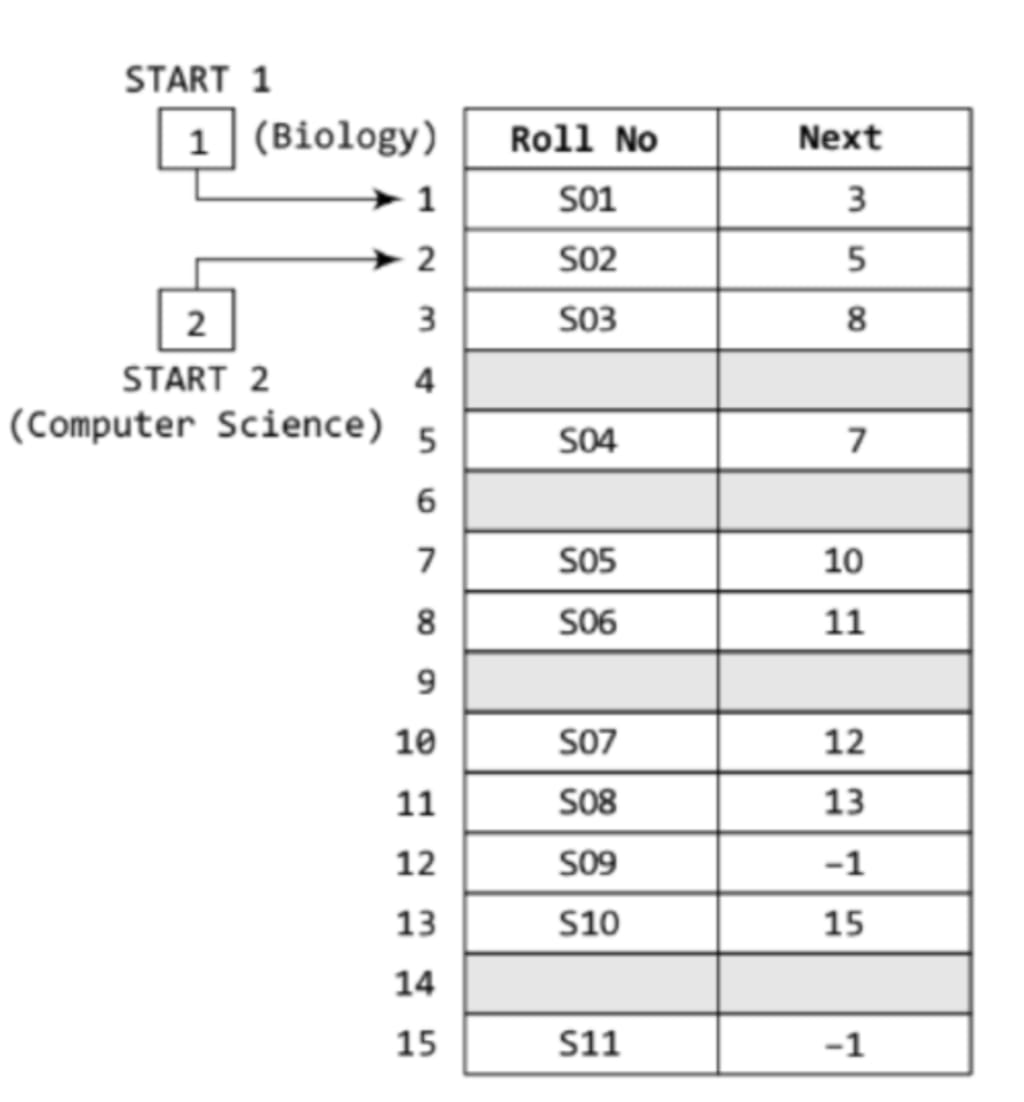 Let us take another example to see how two linked lists are maintained together in the computer’s memory. For example, the students of Class XI of Science group are asked to choose between Biology and Computer Science. Now, we will maintain two linked lists, one for each subject. That is, the first linked list will contain the roll numbers of all the students who have opted for Biology and the second list will contain the roll numbers of students who have chosen Computer Science.