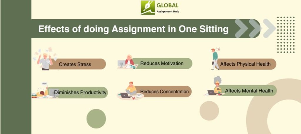 Doing your assignment in one sitting can affect your mental health. It can lead to negative outcomes in academics. Moreover, taking regular breaks can help your brain to take rest. It will help your brain to think creative & innovative. You can think out of the box if you take regular breaks. So you should avoid writing an entire assignment in one sitting as it can affect your mental health & can diminish your creativity.