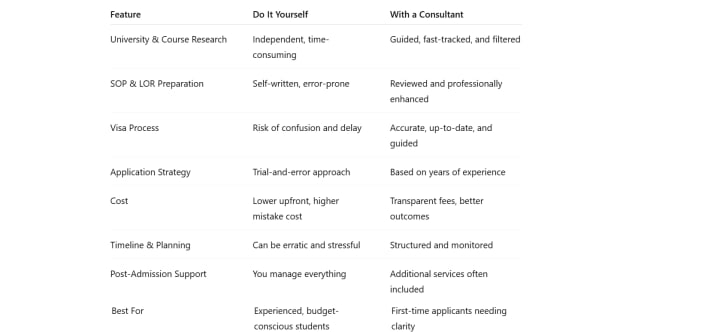 Researching on your own offers freedom. You can explore universities, watch YouTube videos, read student forums, and contact admissions offices directly. But the volume of information can often be overwhelming. Moreover, official websites can miss finer details like embassy appointment delays or changing visa rules.