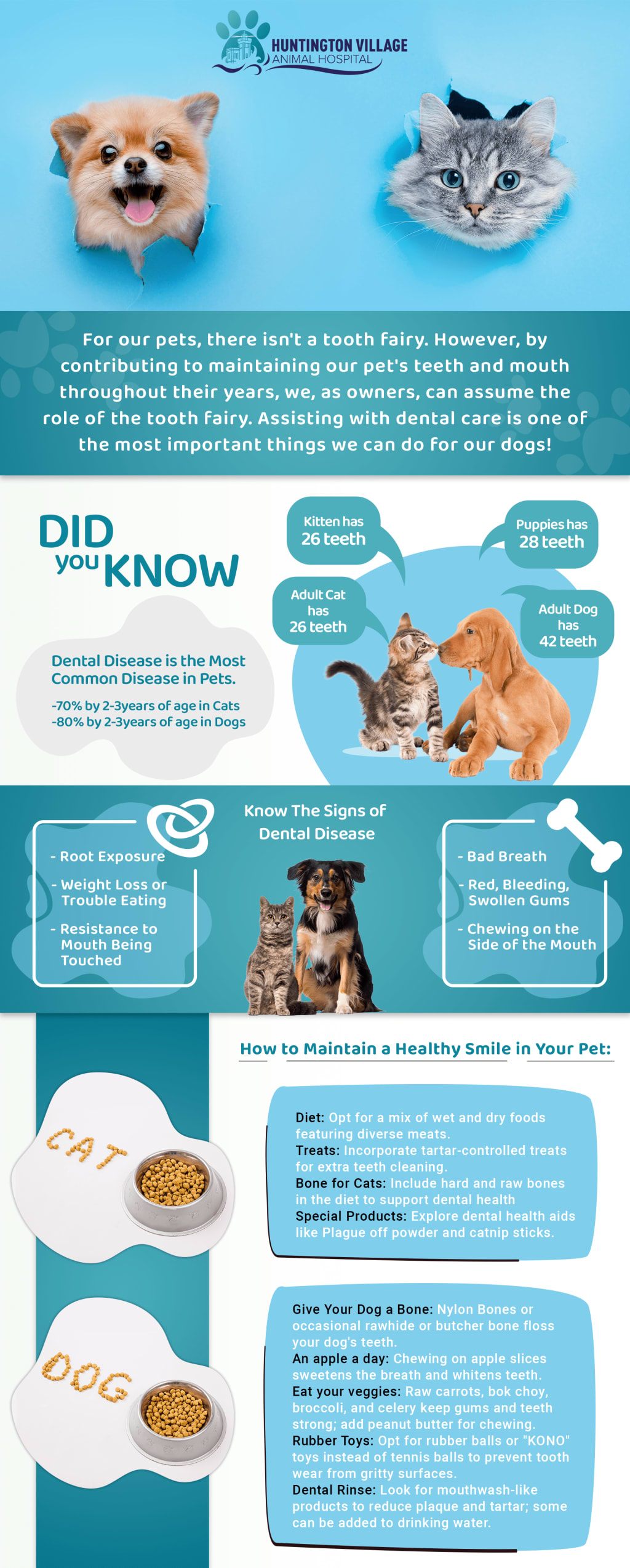 Veterinary clinics and hospitals are pivotal in providing comprehensive dental care for pets. Esteemed establishments such as the Huntington Village Animal Hospital offer a wide array of veterinary services designed to cater to the unique dental needs of our furry friends. These facilities boast skilled veterinarians and dental technicians proficient in conducting thorough dental examinations, professional cleanings, and even complex dental surgeries if required. Regular visits to these veterinary clinics enable the timely detection of dental issues, preventing their progression into severe conditions and safeguarding our pets' oral health.