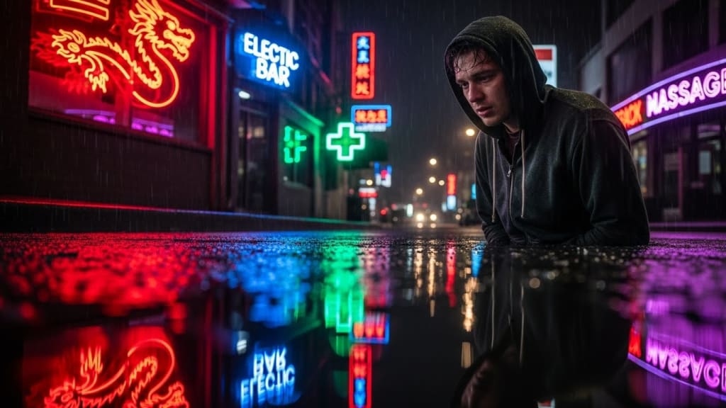He slammed the book shut, the thud a small, satisfying rebellion. Needed air. Needed anything but the quiet hum of the laptop and the accusing blankness of his own drafting paper. He pulled on a frayed hoodie, grabbed his keys, and walked out of the dorm, the narrow hallway smelling of stale coffee and desperation. Outside, the city was a shivering mess of sound and light. Rain, again. A persistent, cold drizzle that coated everything in a slick sheen.