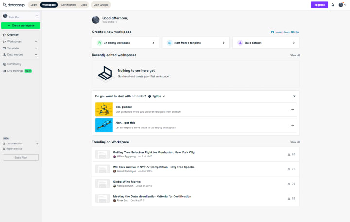 Overall, DataCamp Workspaces is a convenient and powerful platform for data scientists to work on their projects, and provides a range of features and resources to support data science education and professional development.