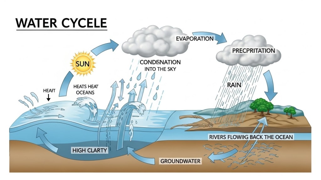 Water is one of the most essential substances on Earth. It covers over 70% of our planet’s surface and is crucial for all forms of life. But have you ever wondered how water moves continuously around the Earth? How rivers, oceans, clouds, and rain are all connected in a constant cycle? This amazing natural process is called the water cycle, and it ensures that life never runs dry.
