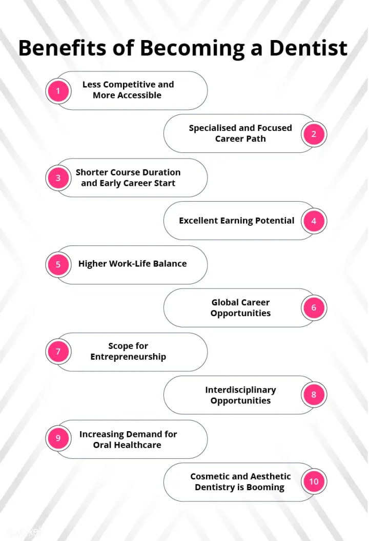 Here is your ultimate guide for the plan “B” of becoming a dentist rather than a doctor. Refer the below image to check the benefits of becoming a dentist.