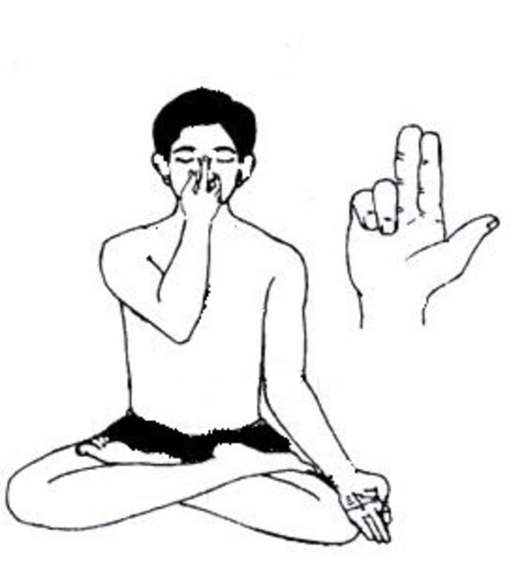 To practice alternate nostril breathing, use your right hand to close your right nostril with your thumb, and inhale deeply through your left nostril. Close your left nostril with your ring finger, and exhale through your right nostril. Inhale through your right nostril, close it with your thumb, and exhale through your left nostril. This is one cycle. Repeat for several cycles.