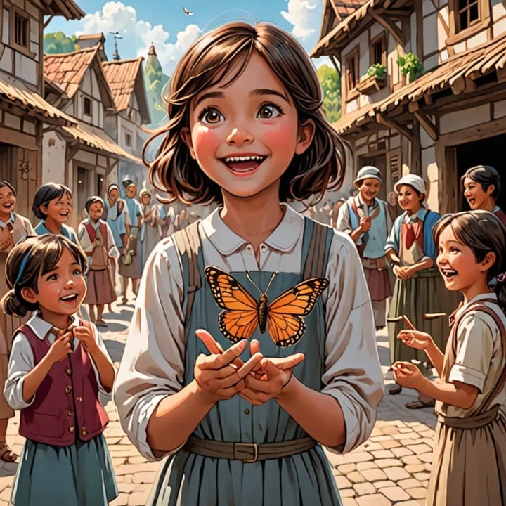 She returned to her village with the butterfly. As soon as she arrived, the curse lifted. The villagers cheered with joy, their faces bright with relief.