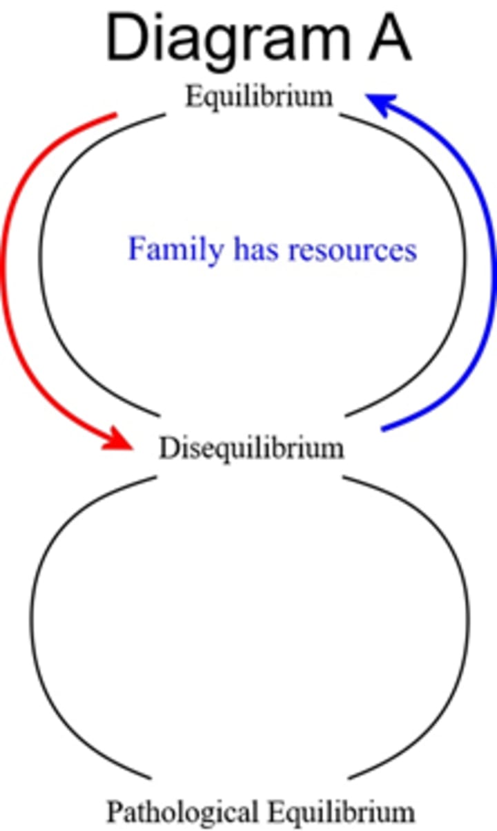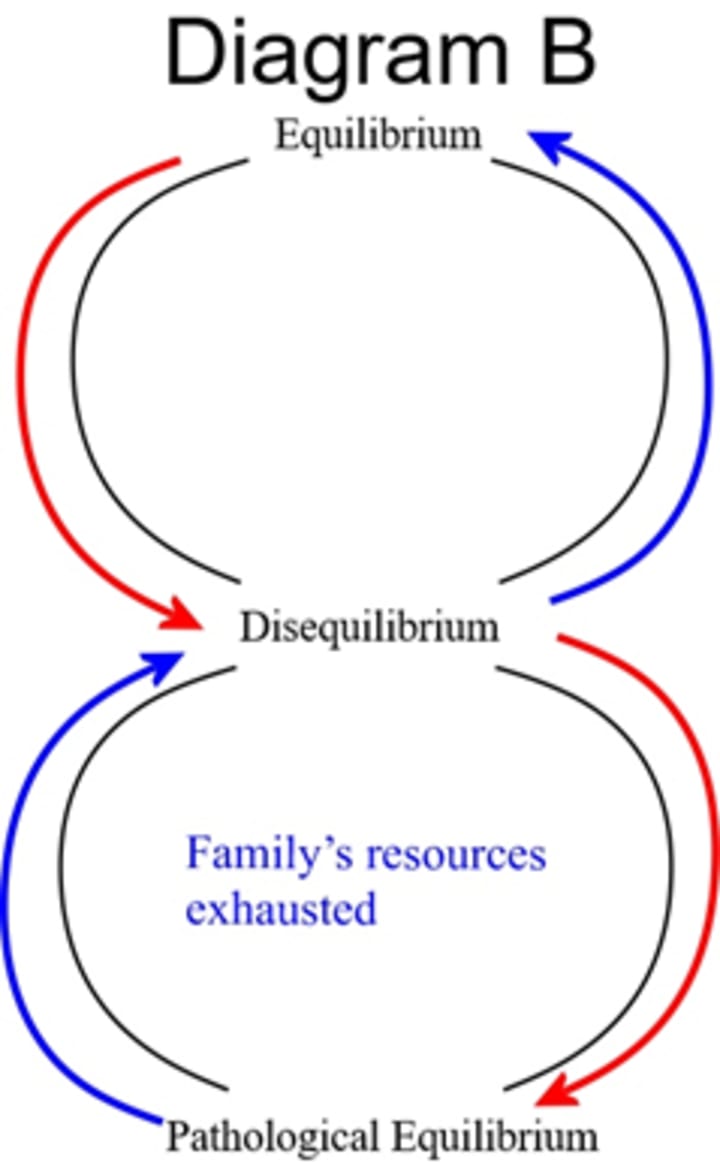 Diagram “B” explains why the family can’t simply return to its normal state of equilibrium. You will notice that in order to get back to normal they would have to pass through a state of disequilibrium. (Represented by the blue lines). The realignment of roles and relationships is too difficult without help because the new (pathological) arrangement has become the norm. It’s not ideal, but it’s familiar. Each party is afraid to change because they have lost faith that the other party will follow through.