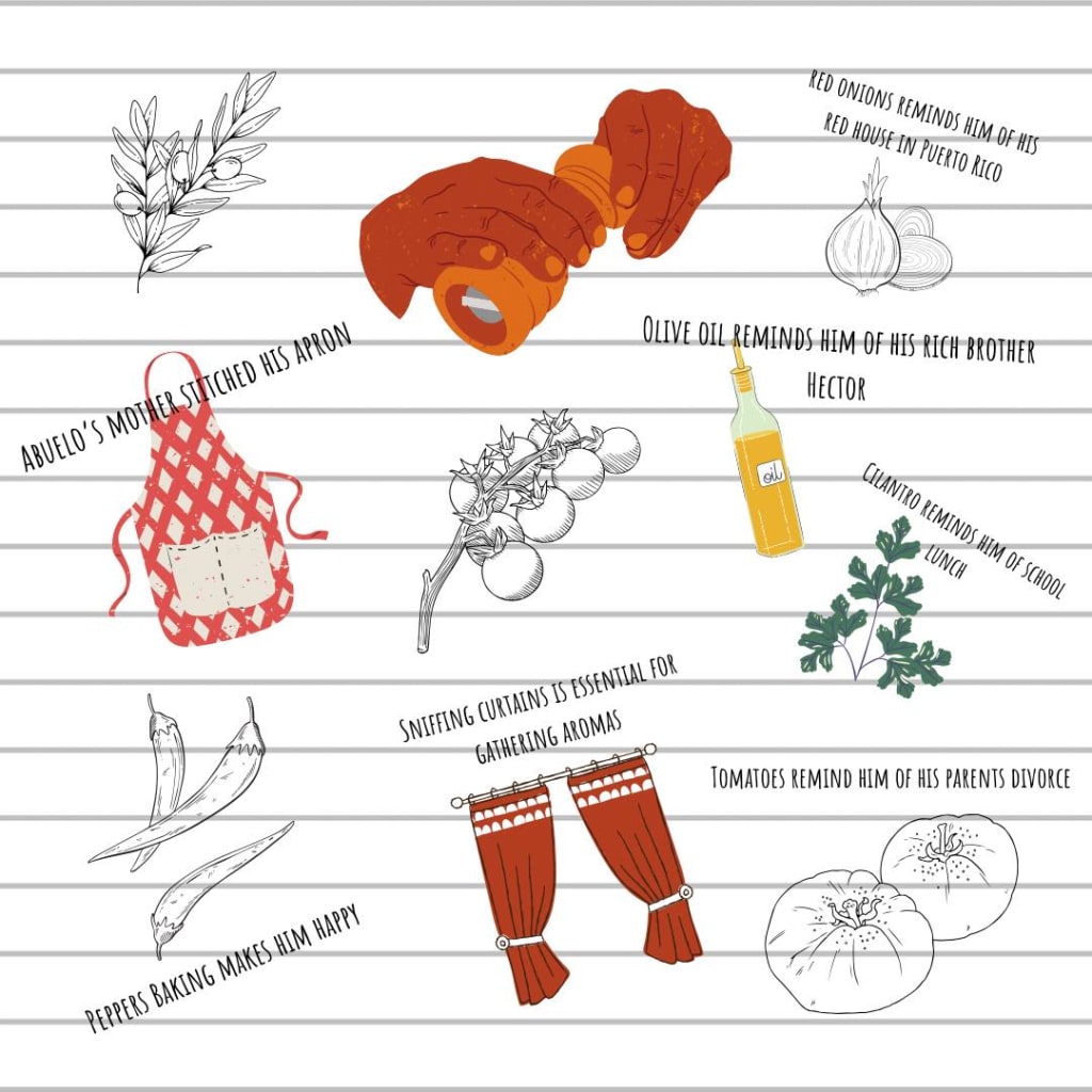 There were times when it was the day after, and I would catch him in the kitchen sniffing aromas out of the curtains while nodding or frowning. Later I'd go after him when he wasn't looking and sniff away, trying to sense the feeling he was trying to convey. In the kitchen with his red checkered apron is where he was most confident. His hands are rough like a man who's worked with his hands all his life. He's a short man but he never felt small to me. His warm expressions and dark eyes drew anyone in. He never spoke without eye contact. His skin was a beautiful caramel shade just like mines. He’s the kind of man you felt his sense of urgency to take care of you. Food is the main way he was able to express himself when words fail. I could feel it from the glint in his eyes as he smelled each tomato before rinsing them. Cupping them in his palms, he'd then carefully place back the tomatoes that didn't make the cut. I tried to smell the subtle differences in them, but I just couldn't get what he did. Abuelo took pride in showing me how to cook. He never forced it on me, but I knew it made him happy whenever I joined in or simply watched. Especially when I took notes in my black journal. Sometimes I'd catch him smirking whenever he saw me intrigued. Smirking always meant something positive. Abuelo always said it wasn't about making a tasty meal but instead conveying a feeling or memory. He was trying to recreate the aromas from childhood through his mother's recipes. Whenever I wrote in my black book, I was mostly jotting down the emotions and memories attached to the foods. With every meal came a story.