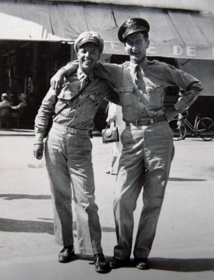 She held up a cracked black and white photo wedged between two of the pages. Their grandfather, thin and handsome in his uniform, stood with his arm around another man’s shoulders. The background showed what looked like an open air market.