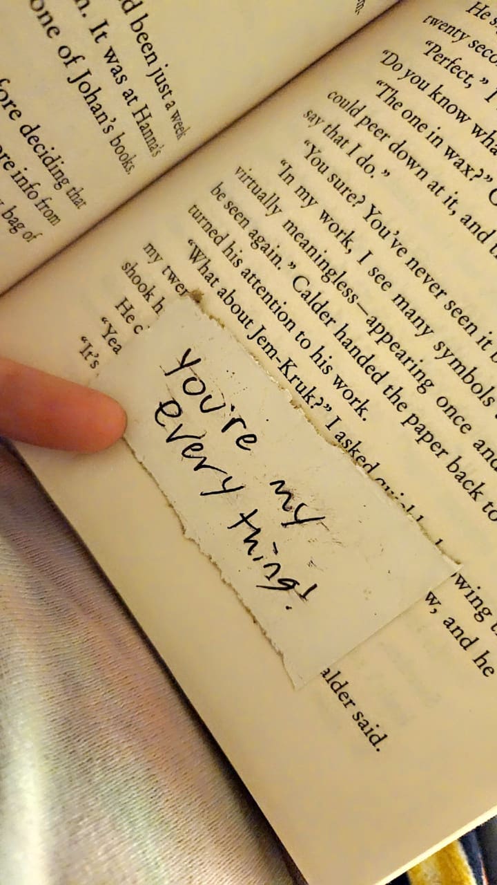 Last night, I had discovered he was leaving notes in the other book I was reading. He left me three love notes. It pushed me to finish the book faster and just gave me another reason to love him more.