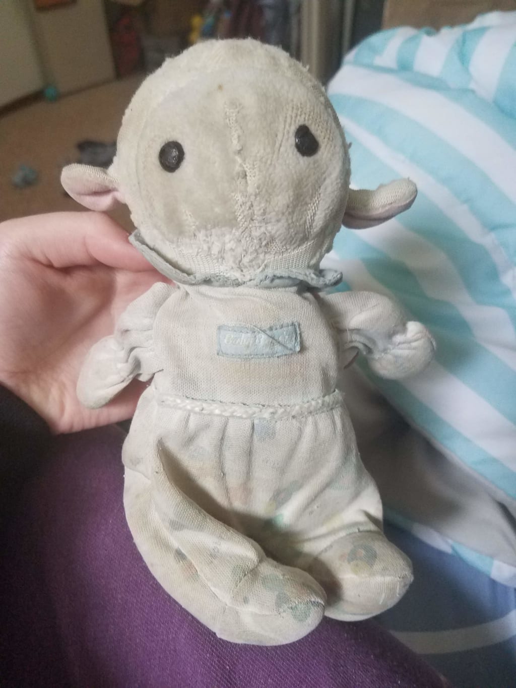 Hockey is a Baby B’Gosh lamb. A baby shower gift to my mom, he was my very first stuffed animal. When I was little, Hockey went everywhere with me. He sat next to me in my car seat, buckled in for safety. I let him ride the conveyor belt at the grocery store when my mom wasn’t looking. We even met the Easter bunny together.