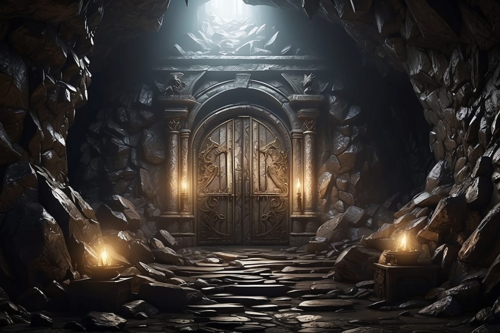 The map led them to a hidden cave, guarded by a massive stone door. Alex, being the strongest of the three, pushed with all his might, and the door creaked open, revealing a dark and mysterious tunnel. Armed with torches, they ventured into the unknown, their footsteps echoing through the narrow passage.