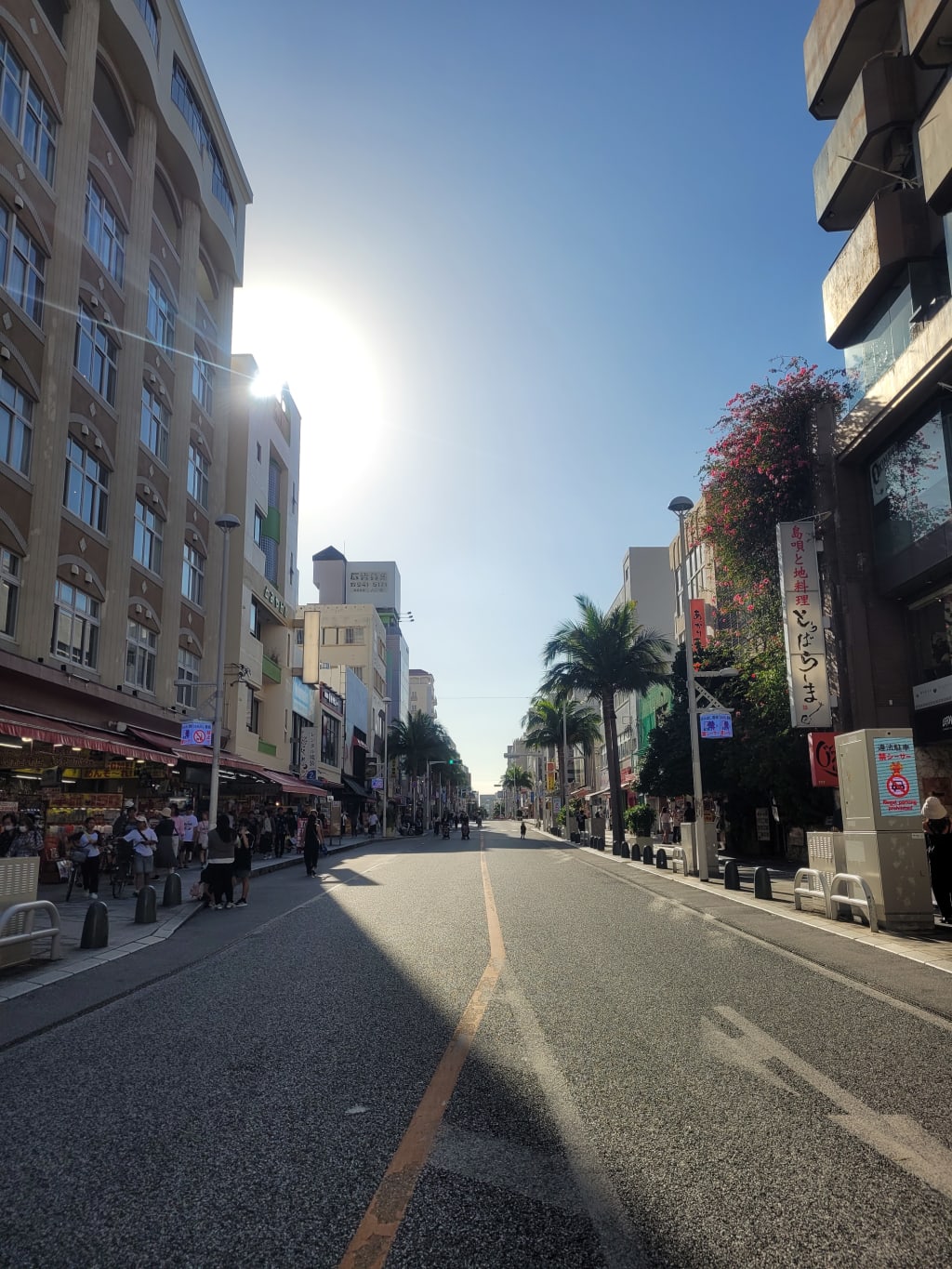 It's Sunday afternoon in a sunny and humid November, during the hours of "Pedestrian Heaven" (歩行者天国, “hokou-sha tengoku”). Closed to drivers for these truly heavenly hours, Kokusai-dori has been freed from its normal gridlock, but the pedestrians perusing the gift shops and restaurants stick to their normal safety habits.