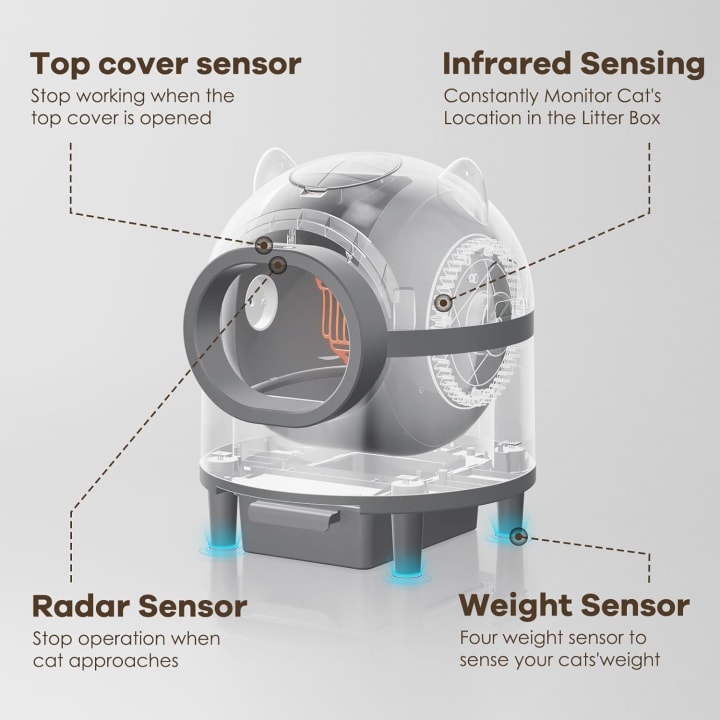 Safe for Cat: The Amztoy cat litter box self-cleaning prioritizes your cat's safety. Equipped with sensors that detect your cat's presence and a delay mechanism that prevents the cleaning cycle from starting when your cat is inside, rest assured that your feline companion is safe and secure.