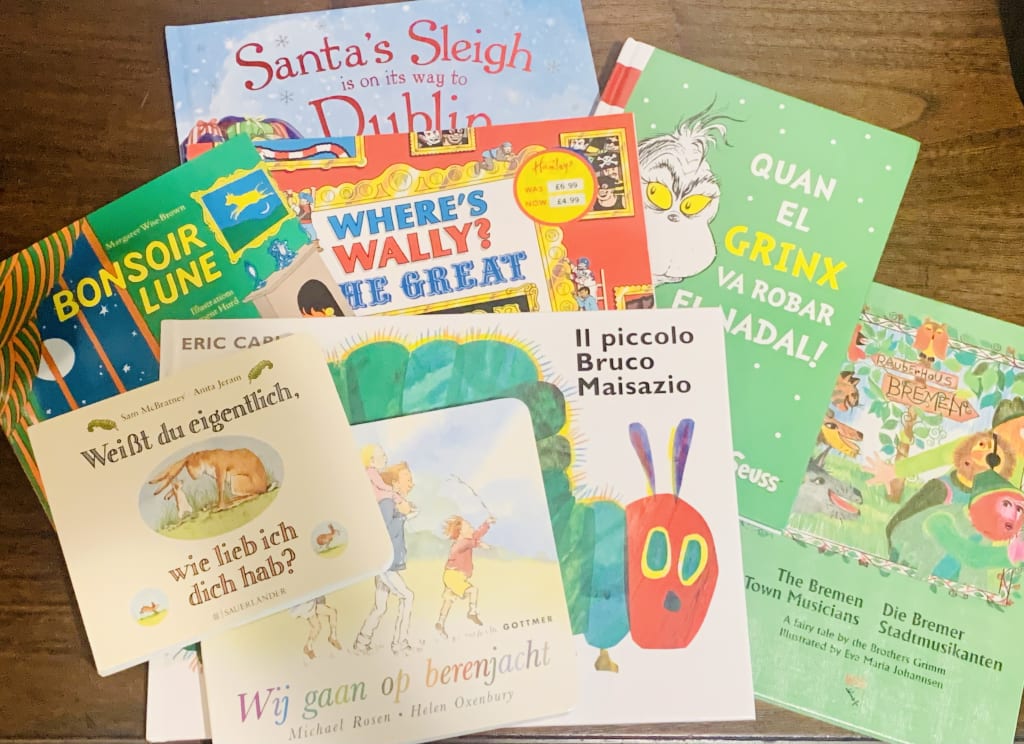 After the first book, when I would travel I made it a point to visit the local bookstore and buy a book in a different language. I would head towards the children's section and see all these books I used to read as a child but in another language. I found that fascinating! It was sweet nostalgia seeing the familiar covers of The Very Hungry Caterpillar, Goodnight Moon, Where's Waldo? and many more. I love that no matter the country, children from around the world grow up reading the same stories. We share a love for the beautiful illustrations of Eric Carle, the witty rhymes of Dr. Seuss, and the hard-to-find man in a red and white striped shirt, bobble hat, and glasses. I also found that by reading children's books in French, German, or Italian, helped me learn the language as they are easy to understand with short sentences, pictures, and simple vocabulary.