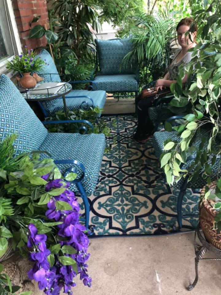 I filled my small space with an abundance of green foliage and purple flowers. I found some rusty garden chairs and painted them up to match the porch. I used fiskars wire cutters and 5" snips to cut netting and tie everything in place with wires so it wouldn't blow down in a storm. The netting meant I could hang fake ivy everywhere for shade and privacy.