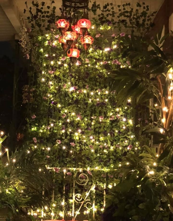 I started off the Hanging gardens with strings of solar-powered rainbow lights and some planters. And a lot of fake flowers. I know, I know - what about the bees... but a safe place for kids doesn't really involve bees if I'm honest.