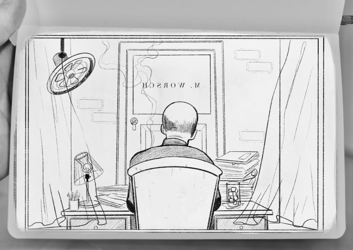 The fan's blade made it hard to hear what Mr. Worsch said behind his thin closed lips. Sirens in the distance became the soundtrack to our standoff. Embers from the old cigarette dimmed. I had won.