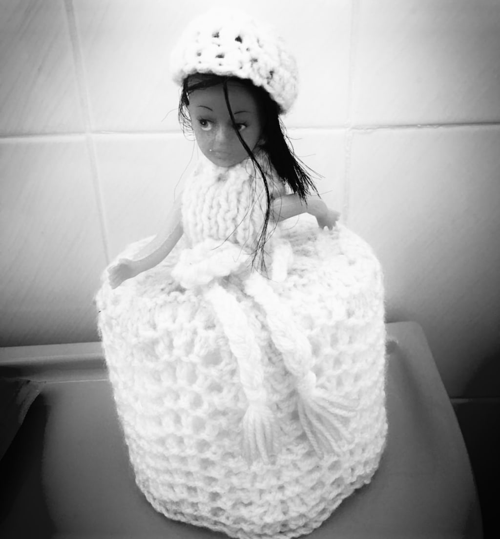 On the shelf above the loo was the crochet lady toilet roll cover that her daughter had always made fun of. It was dusty and looked like it had been left untouched since the 70s.